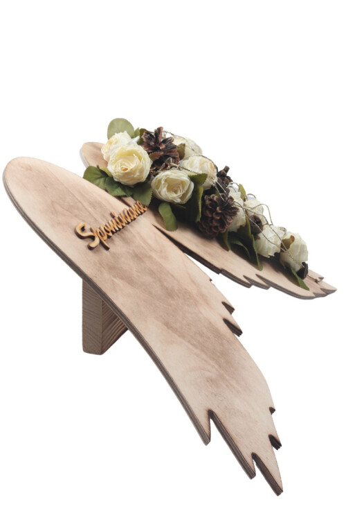 Dekoračný aranžmán - anjelské krídla drevené, Florex sec - suchý, kytica peónia, šnúrka s drôtikom, sušina eukalyptus, sušina šiška, drevený nápis.