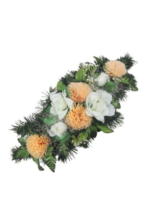 Aranžmán s ružami, chryzantémami, listami, rumorou a prízdobou.
