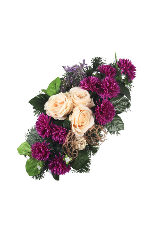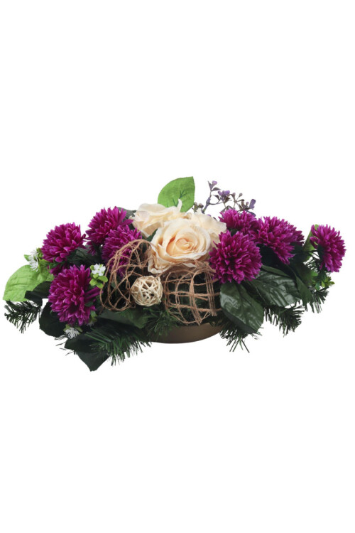 Aranžmán s chryzantémami, ružami, listami a doplnkami.