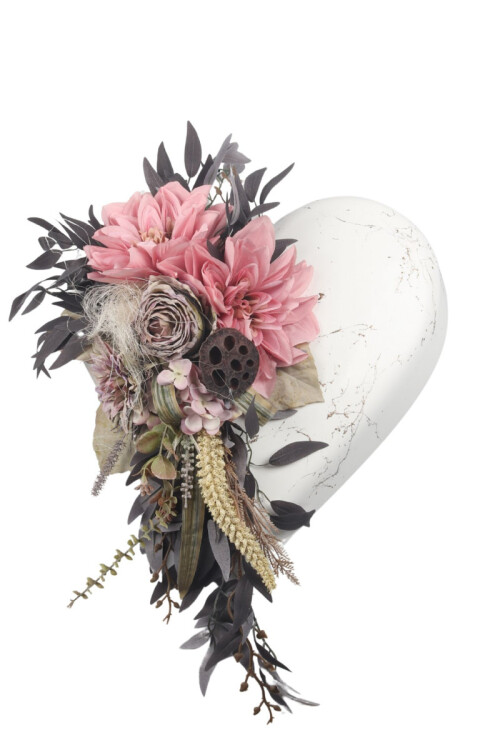 Aranžmán : plastové srdce mramorové, kytička ruža a dálie, ruskus, sušina, Florex sec, suchý
