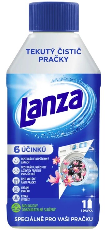 Tekutý čistič práčky Lanza so sviežou vôňou ponúka kompletné riešenie pre vašu práčku so 6 účinkami – čistí a odstraňuje zvyšky špiny a pracieho prostriedku zo všetkých vnútorných častí práčky, udržiava vnútorné súčasti práčky čisté, a tým zaručuje jej optimálne fungovanie a v práčke zanecháva príjemnú a dlhotrvajúcu sviežu vôňu. Vyskúšajte tekutý čistiaci prostriedok na práčku Lanza, vďaka biologicky odbúrateľnému zloženiu je navyše šetrné k životnému prostrediu.