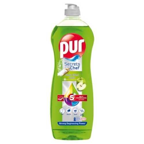 Tekutý prostriedok na umývanie riadu s účinnou odmasťovacou silou, Soda Effect, Jablková vôňa, Nový Pur 5+ so samoodmašťovacím zložením - sám rozpúšťa mastnotu.