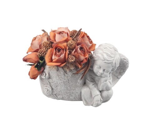 Krásny aranžmán anjelika s črepníkom a ružami na hrob.