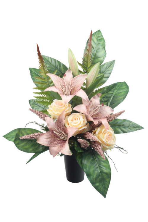 Aranžmán - kytica s plastovou vložkou do zaťaženej vázy na hroby. Kytica s ľaliami, ružami, listami a prízdobami.