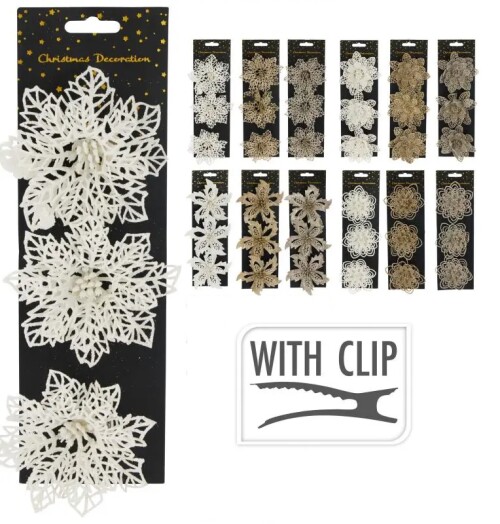Kvet na klipe s trblietkami je štýlovou a lesklou vianočnou ozdobou, ktorú možno ľahko pripevniť na vetvu vianočného stromčeka, girlandu alebo dekoratívnu kompozíciu. Každý kus je k dispozícii v náhodne vybranej farbe alebo vzore, čo prináša prvok prekvapenia a rozmanitosti do dekorácie. Brokátová povrchová úprava krásne odráža svetlo lámp a dodáva interiéru vianočný lesk.