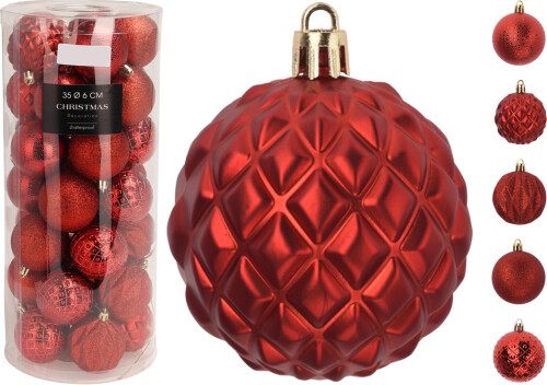 Krásna súprava vianočných gúľ v červenej farbe. V sade je 35 guličiek v červenej farbe s rôznymi štruktúrami. Vianočné ozdoby sú bezpečné a sú vyrobené z plastu, čiže pri náhodnom spadnutí sa nerozbijú. Vhodné na umelý aj živý stromček. Priemer každej vianočné ozdoby je cca 6 cm. K súprave sú pridané prívesky pre vlastnú montáž.