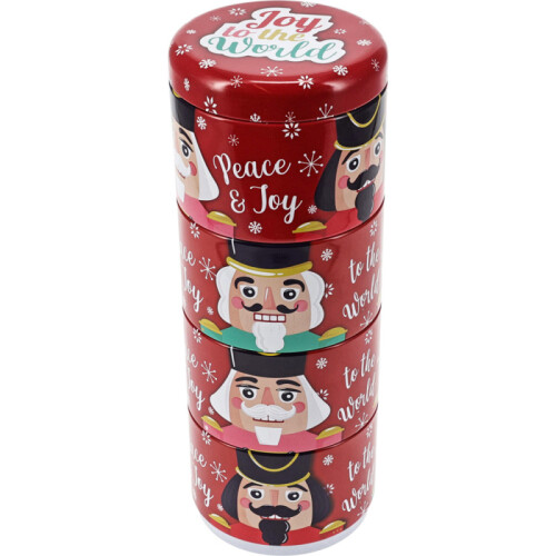 Táto sada plechoviek na uloženie Luskáčika obsahuje štyri stohovateľné okrúhle plechovky vyrobené z červeného kovu. S výškou 22,5 cm a priemerom 8,5 cm sú vďaka slávnostnému vzoru ideálne na uloženie koláčikov a vykrajovačiek na koláčiky.