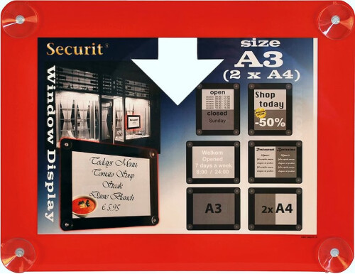 Plastový sklenený rám sa používa na jednoduché zavesenie vytlačených informácií na sklo (napr. informácií o otváracích hodinách...). Rám má priehľadnú platňu na oboch stranách a tlačené papiere sa do nej jednoducho vkladajú zasunutím. Upevnenie na sklo zabezpečujú 4 prísavky.