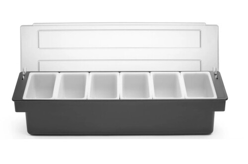 Na použitie v baroch, krčmách a reštauráciách Vyrobené z najkvalitnejších plastov Puzdro z HIPS a priehľadné veko z ABS chráni potraviny pred kontamináciou alebo hmyzom. 6 polypropylénových nádob pre oddelené skladovanie doplnkov - ovocie alebo korenie Každú nádobu je možné z držiaka ľahko vybrať, napr. pre doplnenie produktu. Nádoby je možné umývať v umývačke riadu.