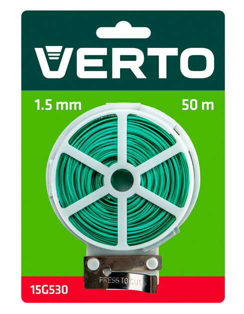 VERTO záhradný drôt (ref. 15G530) s priemerom 1,5 mm a dĺžkou 50 m je ideálny na viazanie rastlín. Je vybavený rezačkou, ktorá uľahčuje prácu. Odolný PVC kryt poskytuje odolnosť voči poveternostným podmienkam a zároveň chráni stonky pred poškodením.